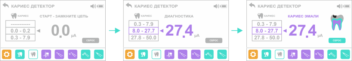 - Диапазон «диагностического» тока в режиме КАРИЕС ДЕТЕКТОР : от 0 до 99,9 мкА (шаг 0,1 мкА)