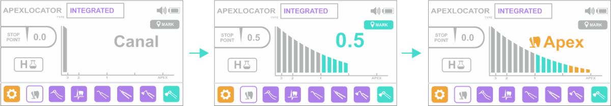 - Функция «Установка метки», позволяющая в процессе измерения рабочей длины отмечать зоны искривления канала или зоны остановки инструмента для более прогнозируемого процесса пломбирования канала