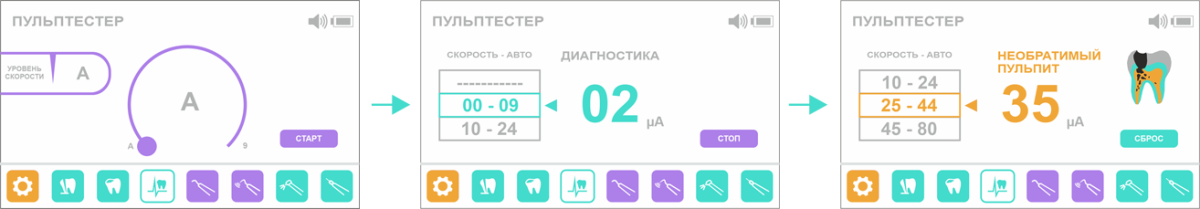 - Диапазон «диагностического» тока в режиме ПУЛЬПТЕСТЕР : от 0 до 80 мкА (шаг 1 мкА)