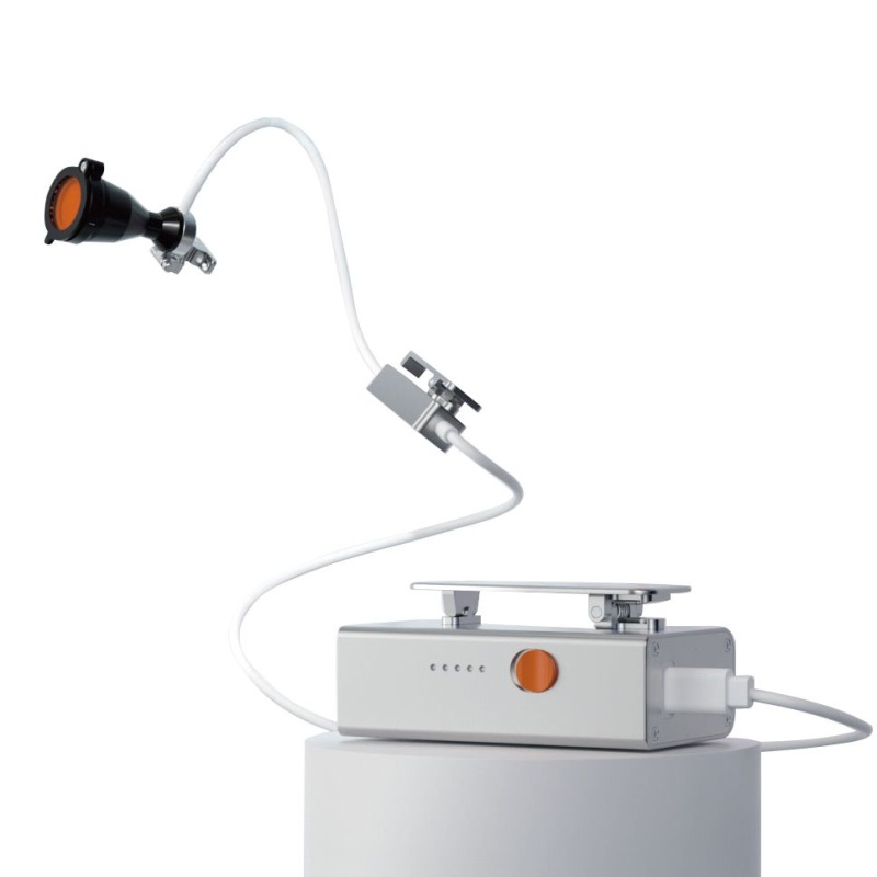 Осветитель работает на съемном аккумуляторе, который легко крепится к поясу или карману халата, предоставляя свободу движения. Компактный и легкий окуляр весом всего 8 грамм выполнен из прочного авиационного алюминия, что обеспечивает долговечность и надежность устройства.